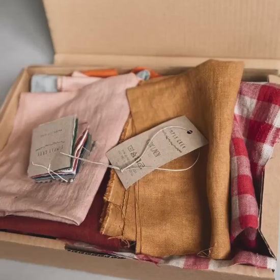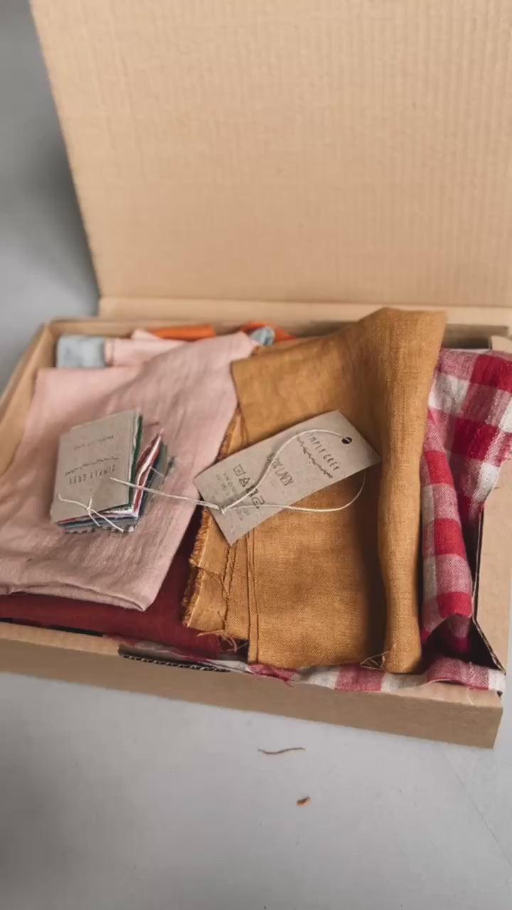 **The linen fabric scraps shown in the photos are for color and style illustration only. Each box varies. The craft boxes are not pre-cut for an individual order, but rather a supply for many projects.